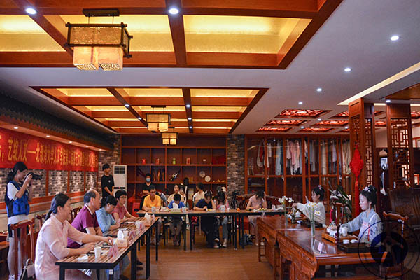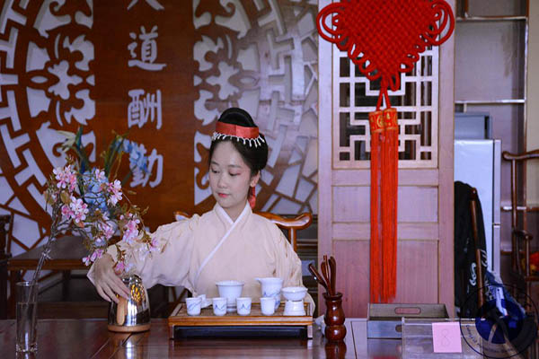 第一个环节为茶艺展示。15位参赛选手两两一组,他们身着华美古服,上演精彩的茶艺表演。一双巧手在茶水间流转,动作行云流水、一气呵成,韵味十足的表演令人回味无穷。评委们从色、香、味、形等方面对选手的表现进行打分。