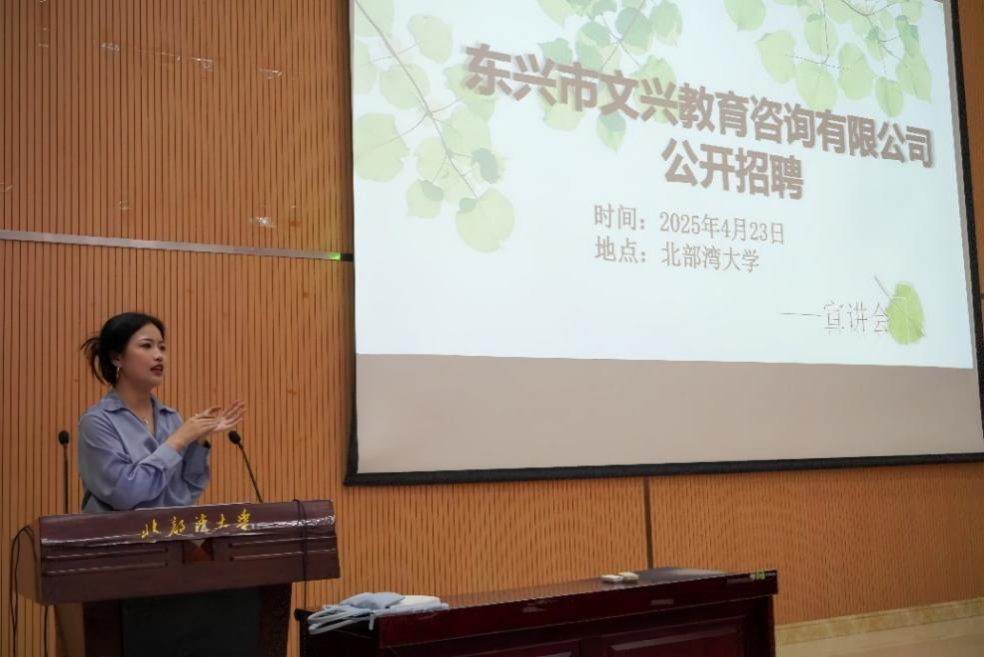 2025年4月23日,永利总站ylzz55举办的东兴市文兴教育咨询有限公司招聘宣讲会在北部湾大学三号教学楼101教室举办。宣讲会吸引了2025届毕业生及在校非毕业生到现场聆听。