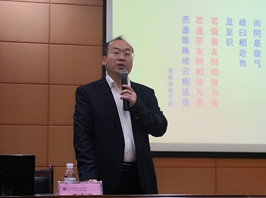 “人性本善还是本恶?”讲座一开始王士祥教授就提出一个趣味性的问题,场上的气氛顿时活跃起来。王士祥教授引用了《论语》里“性相近也,习相远也”来回答这一问题,表明人性的善恶并不是天生的,关键在于成长的环境。随后,王士祥教授用自己读书和成长的经历讲述了环境和读书对个人成长的重要性。指出多读优秀的经典作品是树立正确人生观的基础,是做好人、写好文章的前提。他号召大家要“好读书,读好书”,还向同学们推荐并介绍了《论语》《诗经》《道德经》等经典书籍。王教授通过读书是一种生活品质、读书有利于完善自己等方面告诉同学们读书是提高自己见识的途径。讲座结束后,王教授还与现场的同学进行了问答互动,同学们在本次讲座中受益匪浅,不仅加强了对读书重要性的认识,也了解了读书的方法。