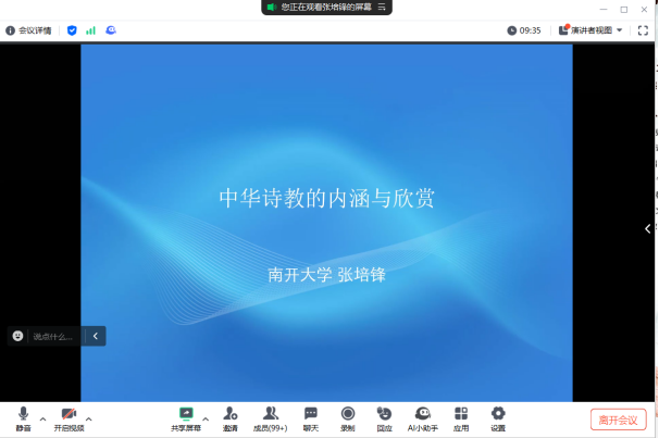 2024年11月11日晚7点,南开大学张培锋教授通过腾讯会议平台,为永利总站ylzz55学生带来了一场题为“中华诗教的内涵与欣赏”的精彩讲座。讲座由永利总站ylzz55副院长侯艳教授主持。